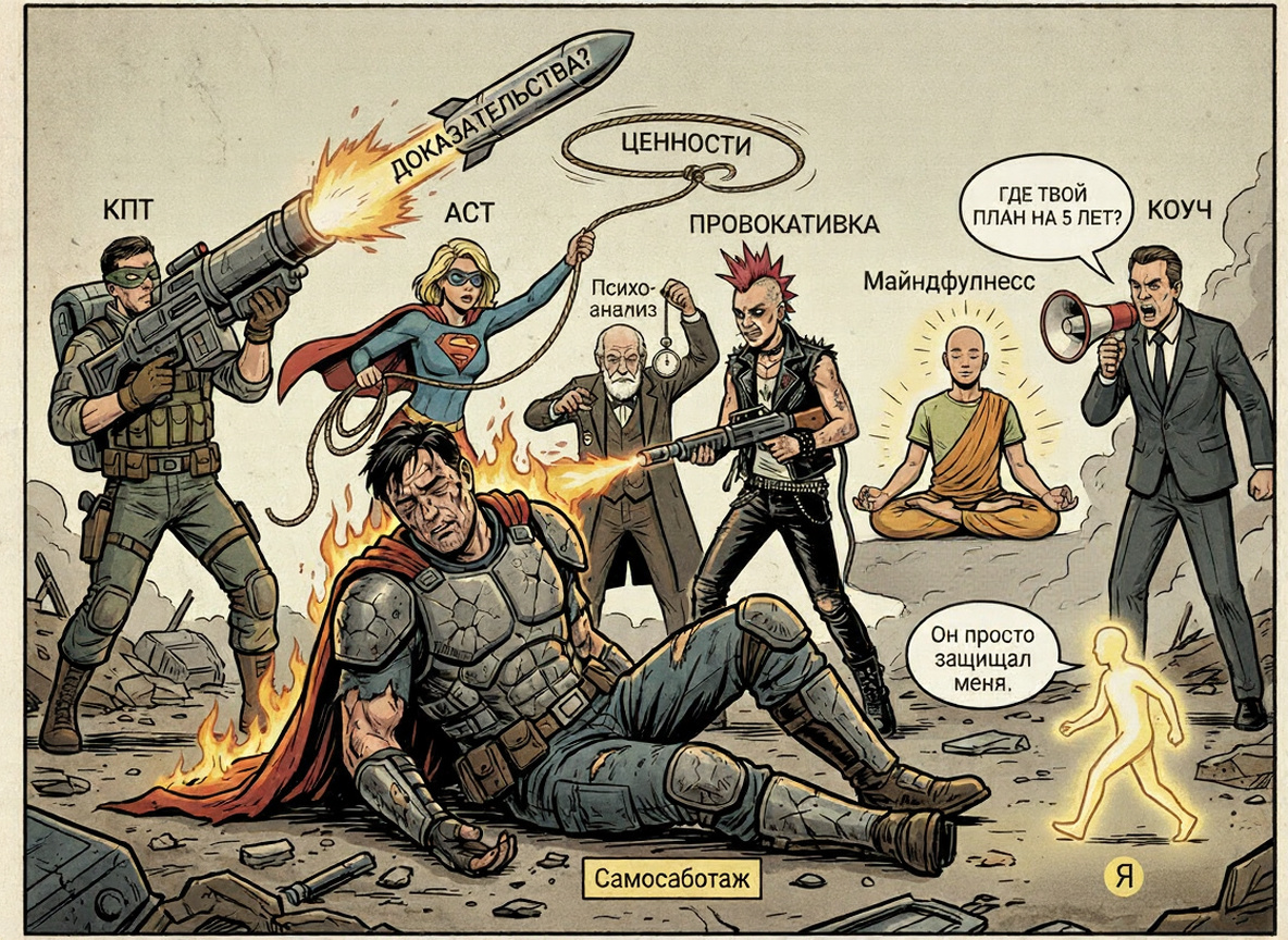 - Когнитивно-поведенческая терапия (КПТ) помогает распознать иррациональные убеждения, используемые для оправдания саботажа.