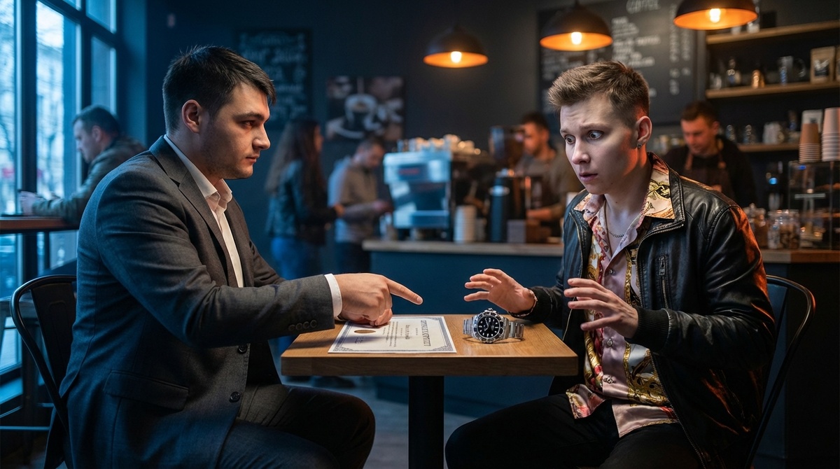 В кофейне Артём столкнулся с Игорем, на запястье которого сверкали его часы. Спокойно, без криков и угроз, он стал угрожать полиции и уголовной статьей, пока Игорь посинел от страха. "Я не знал! Она сказала, что это подарок!"