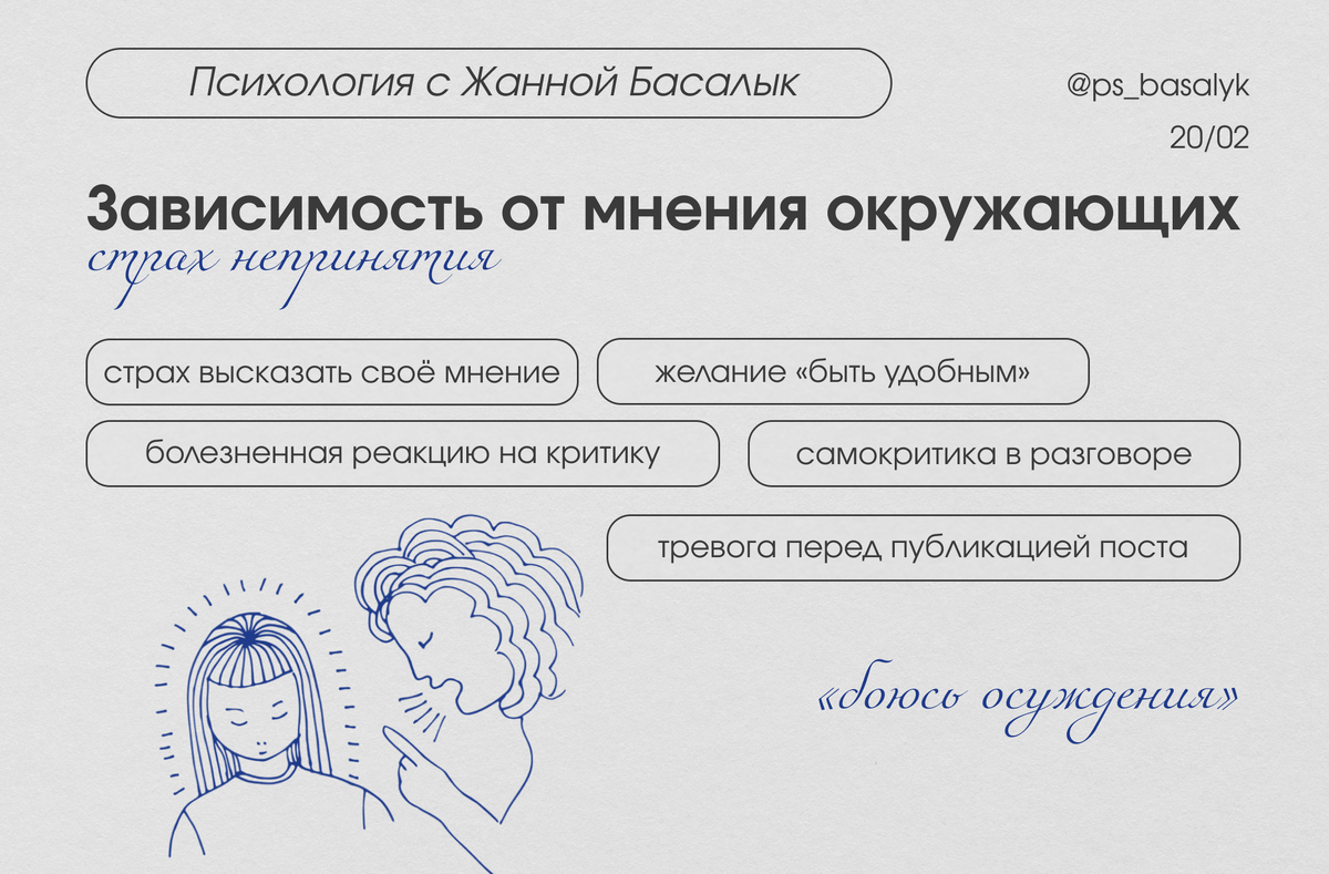 Сквозь призму неуверенности многие люди сталкиваются с мыслями о страхе осуждения и непринятия обществом. Часто это проявляется в фразах: «я боюсь осуждения», «опасаюсь быть отвергнутым», «зависим от мнения других». Эти переживания выходят за рамки простой неуверенности и оказывают серьезное влияние на жизнь.
