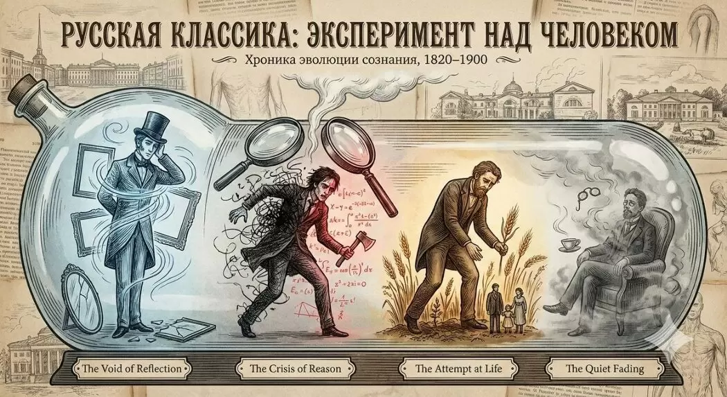 Рождение типа — охлаждение к жизни: В «Евгении Онегине» Пушкина впервые представляется новый герой — свободный, но эмоционально пустой, потерявший иллюзии.Эксперимент с реальностью: В «Герое нашего времени» Лермонтова Печорин осознаёт свою пустоту и начинает изучать жизнь через взаимодействие с окружающими.Рациональность как спасение: Тургенев в «Отцах и детях» через Базарова демонстрирует, как научная идеология становится попыткой преодолеть внутренний кризис, однако высшая идея заканчивается поражением.Внутренняя борьба: В произведениях Гоголя и Достоевского возникает гиперрефлексия, и герой начинает сражаться не с миром, а с самим собой.Идея против жизни: Раскольников в «Преступлении и наказании» реализует опасную мысль о создании смысла через моральное преступление.Паралич воли: Гончаров в «Обломове» показывает героя, который вообще перестаёт действовать.Проживание жизни: Толстой в «Войне и мире» предлагает альтернативу: смысл приходит через опыт и участие в жизни.Тестирование личной судьбы: В «Анне Карениной» Левин олицетворяет переход к реальной ответственности и смыслу, который рождается из любви.Интеллект на пределе: В «Братьях Карамазовых» Достоевский задает вопросы, на которые разум не может дать окончательные ответы.Распад личности: Ставрогин в «Бесах» символизирует утрату внутреннего центра, где свобода становится разрушительной.Тихий финал: Чехов в своих работах демонстрирует постепенное остывание жизни, когда внутренний вопрос остаётся без ответа.Таким образом, если читать эти книги последовательно, обнаруживается, что это не просто отдельные произведения, а единая интеллектуальная биография человека XIX века. От Онегина до Чехова русская литература задает вопрос о том, что происходит с человеком, когда его сознание становится сильнее предложенного ему смысла. Возможно, поэтому эти романы остаются удивительно актуальными, отражая не столько историческую эпоху, сколько постоянный человеческий опыт.