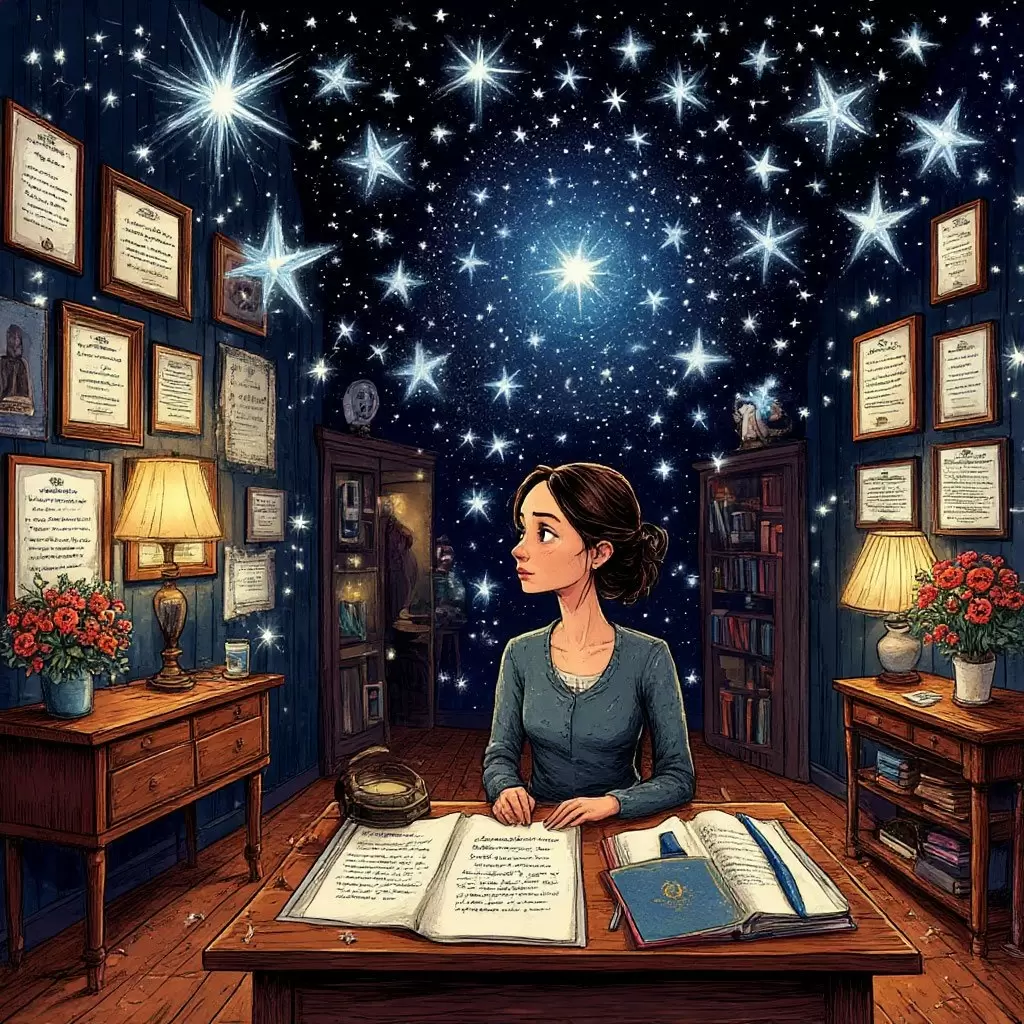 Прошло время, и девочка стала женщиной с домом, заполненным чужими «звёздами» — дипломами, наградами и фотографиями с корпоративов. Эти достижения ослепляли всех, но однажды ночью она проснулась от тишины и поняла, что эти звезды не дают ей тепла, а лишь отражают успехи, чуждые её внутреннему я.