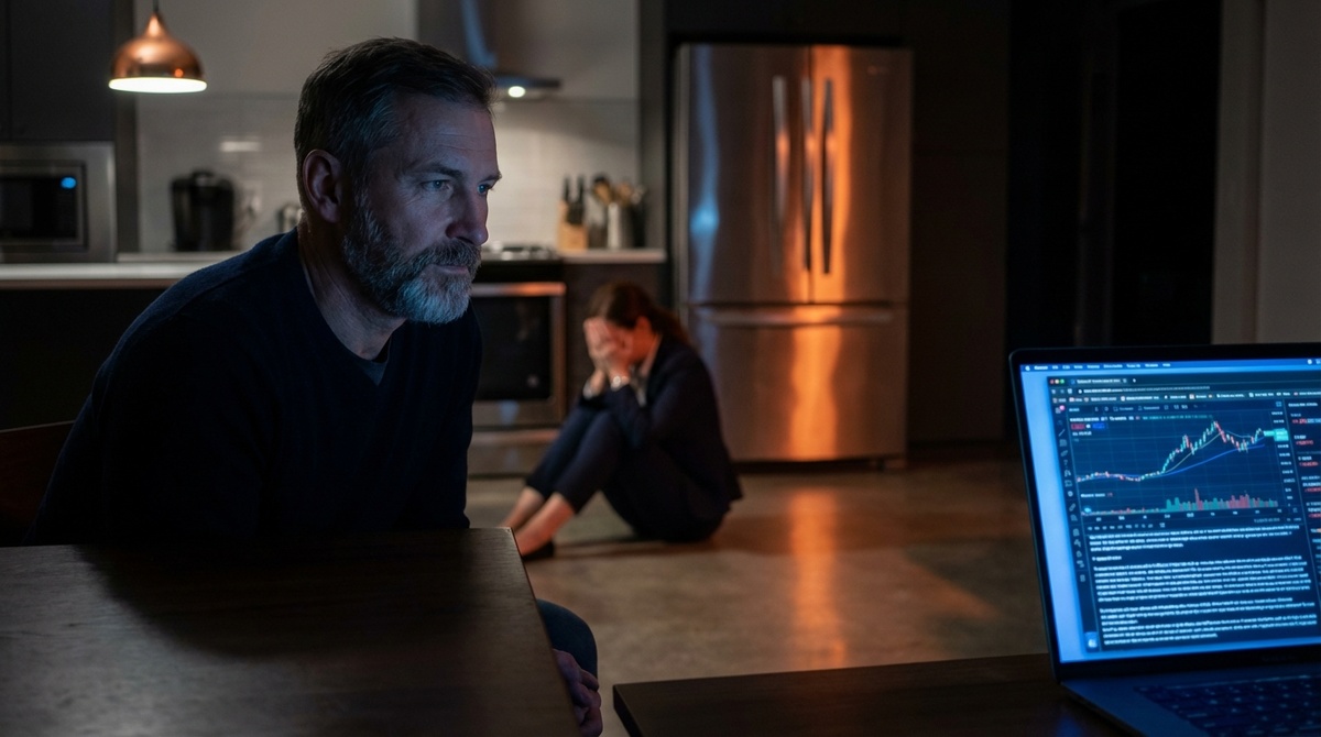 Тёмный экран ноутбука в полночной кухне излучал зловещий свет. Часы на стене показывали половину третьего ночи, когда Лера, жена главного героя, снова заснула, уставшая после своих встреч с потенциальными инвесторами.