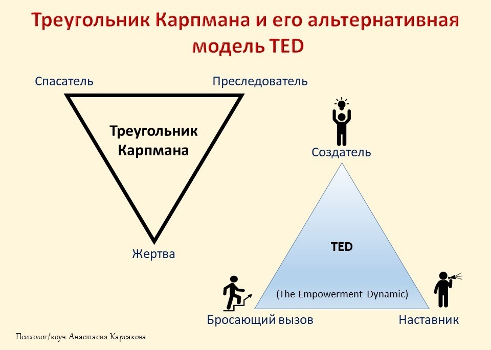 Трансформация мышления может воплотиться через модель TED (The Empowerment Dynamic), введенную Дэвидом Эмеральдом в 2005 году. Эта модель предлагает вместо жертвенности и спасательства перейти к более здоровым ролям: