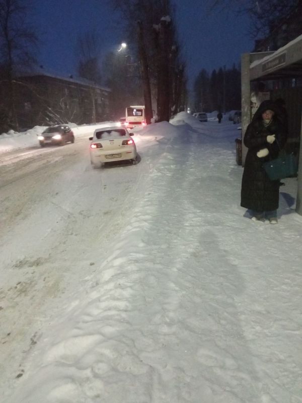 - Снежный отвал затрудняет посадку и высадку людей из автобусов.