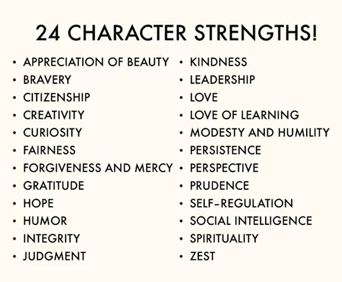 Селигман и его команда выделили 24 характеристики, которые составляют наши сильные стороны. Основная идея заключается в том, что, осознав и задействовав свои сильные стороны, люди могут достичь больших успехов и повысить уровень счастья.