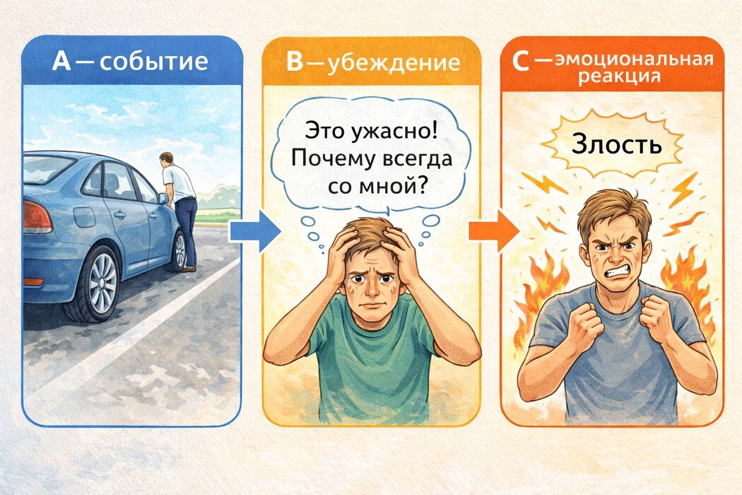 Метод Эллиса фокусируется на пересмотре убеждений, ведущих к негативным эмоциям, а не просто на подавлении этих эмоций. Согласно модели РЭПТ, процесс можно описать так: