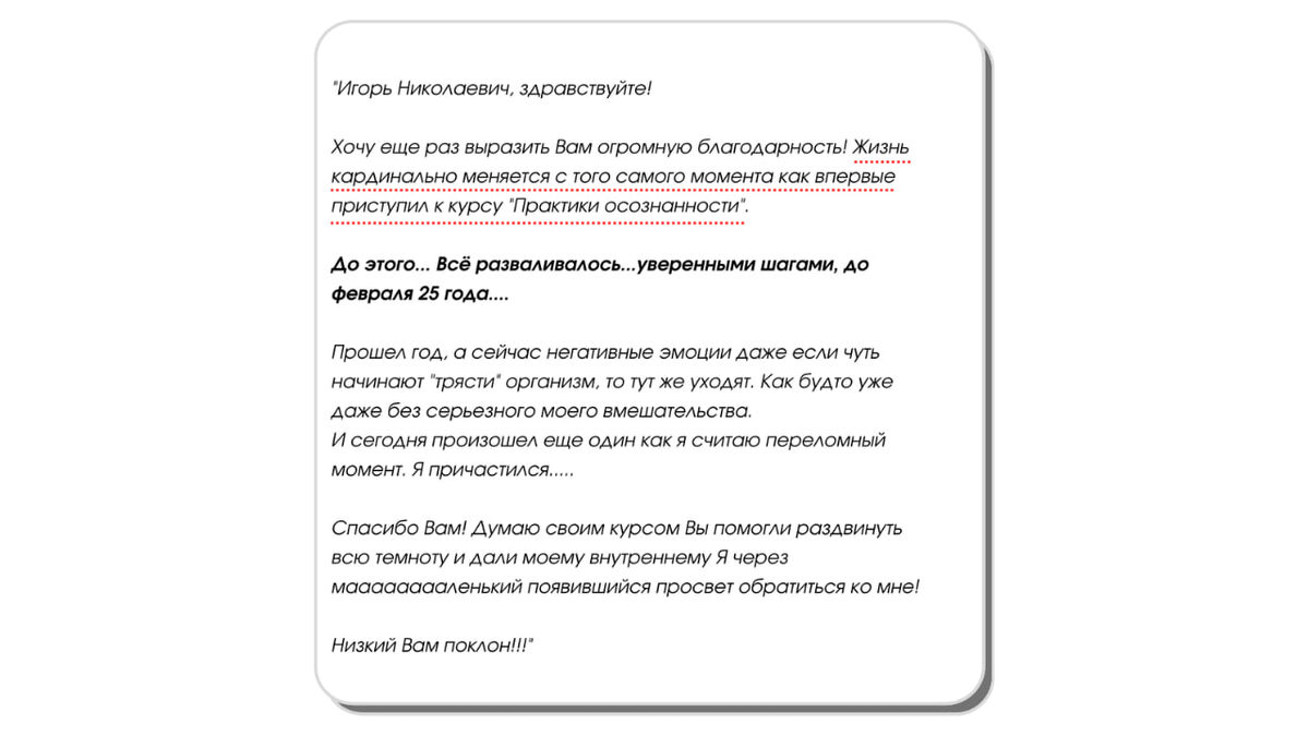 «Здравствуйте, Игорь Николаевич! Меня переполняет благодарность! Моя жизнь изменилась с тех пор, как я начал заниматься практиками осознанности», — пишет он. Как же всё было до начала обучения? У Александра всё шло наперекосяк, особенно до февраля 2025 года.