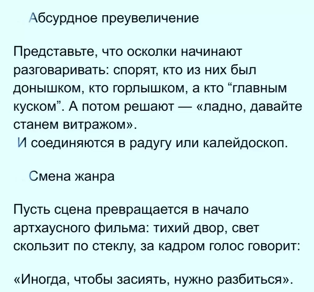 Использование парадоксальной логики и музейной перспективы дает возможность менять восприятие, рассматривая события как объекты анализа. Например: