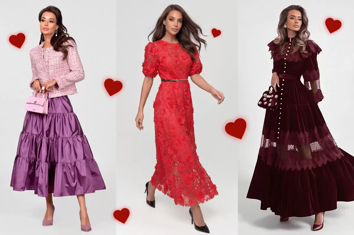 Романтическое свидание по-прежнему остается классикой 14 февраля. В этом случае особенно уместны бордовые и красные оттенки, струящиеся ткани и акцентные детали, которые подчеркивают настроение праздника.